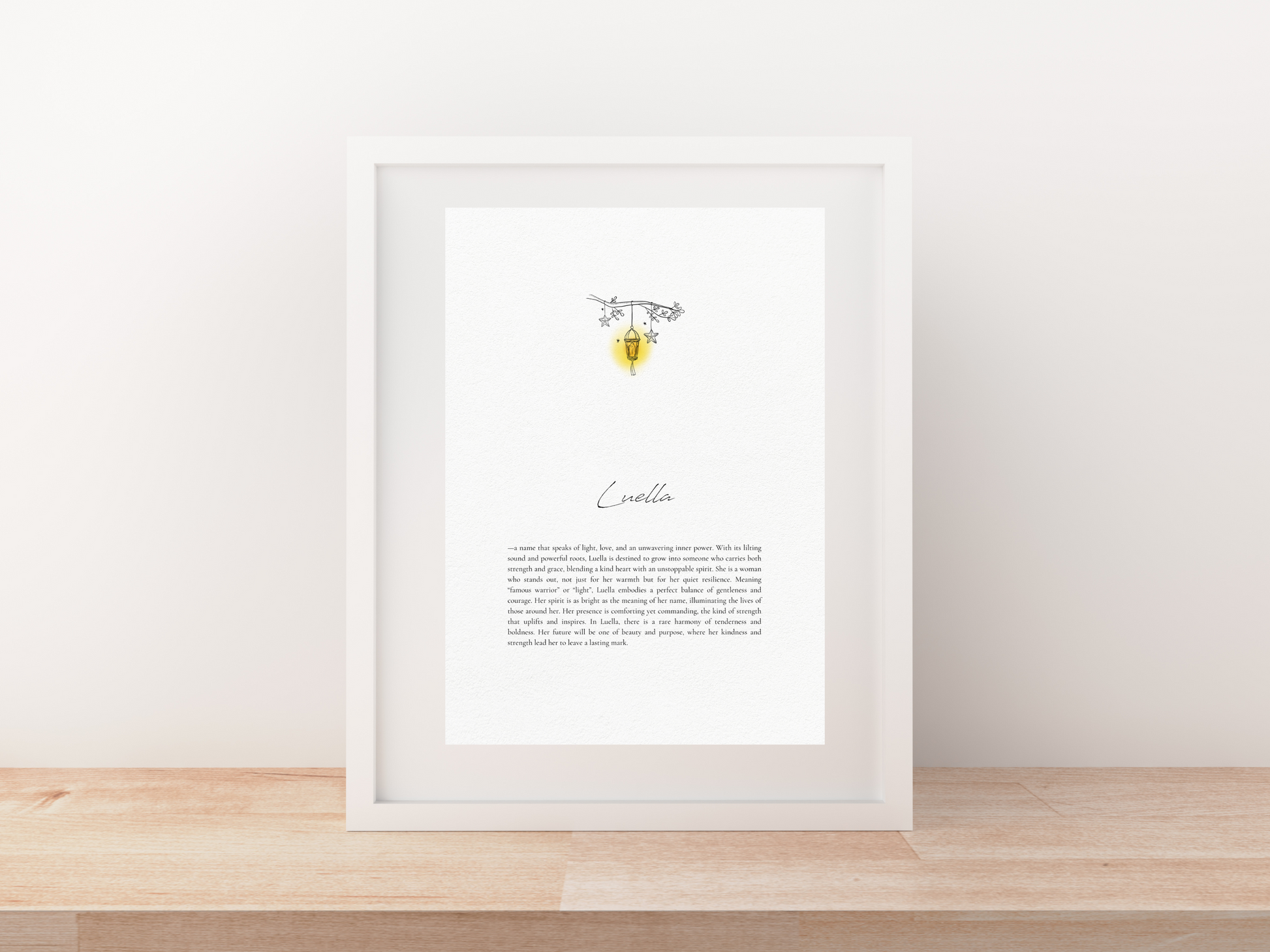 A name carries meaning—sometimes passed down, sometimes chosen with care, always unique. A Namesake print transforms that meaning into art: a soft, minimalist design featuring your chosen name (first, middle, or both), its origin, and a carefully researched definition, paired with a delicate illustration to bring it to life.